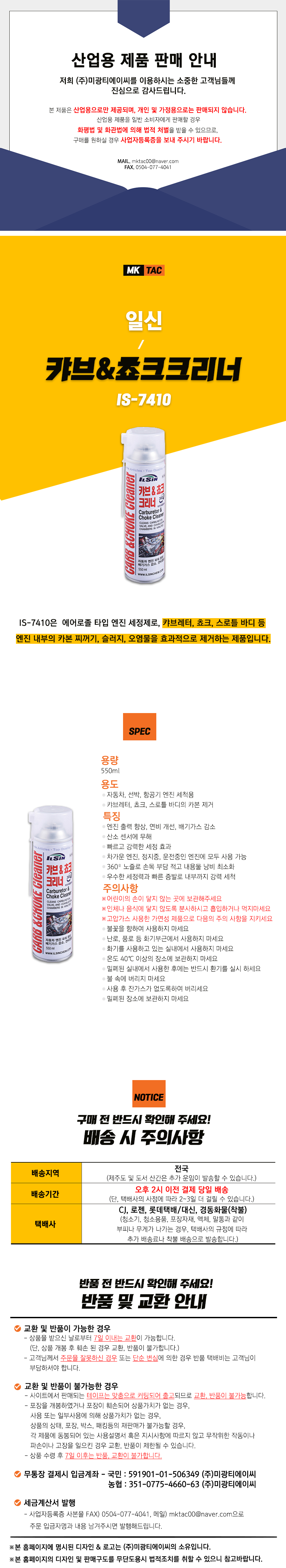 home > ◈ 액상/스프레이 [SP] > 방청윤활/세척용품 > [ILSIN] 일신 캬브&쵸크크리너 IS-7410