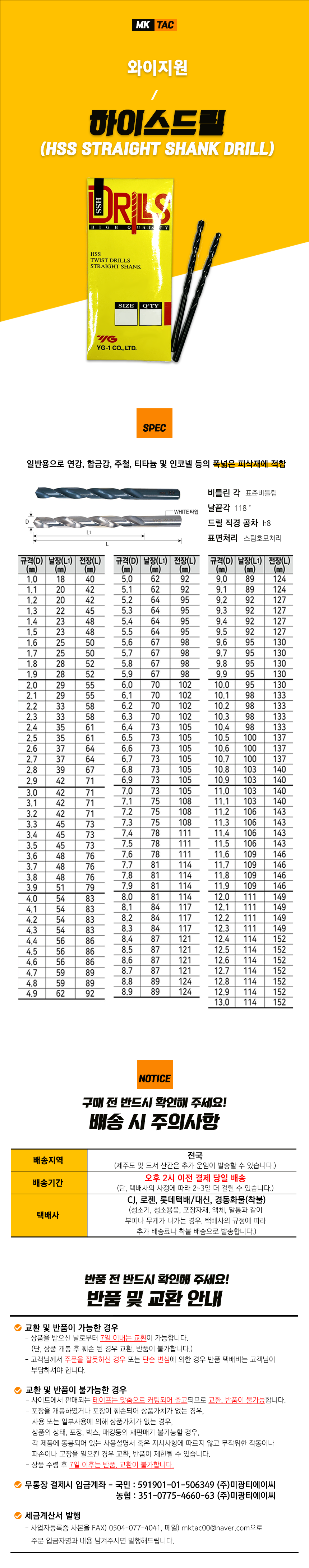 [YG-1] 와이지원 HSS 하이스드릴 일반 기리 (9.0~9.9/1팩 10개)